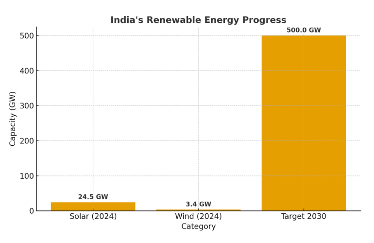 भारत नवीकरणीय ऊर्जा क्षेत्र में एक नया इतिहास रच रहा है। वर्ष 2024 में देश ने सौर और पवन ऊर्जा क्षमता में जबरदस्त वृद्धि दर्ज की, जिसने 2025 के महत्वाकांक्षी लक्ष्यों के लिए मजबूत आधार तैयार किया।